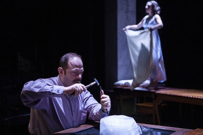 Υπάρχει κι ένα κομμάτι πάγου στο σκηνικό, που λιώνει και οι σταγόνες του πέφτουν στο χώμα… Αναπαρίσταται η ζωή που σιγά-σιγά φεύγει;