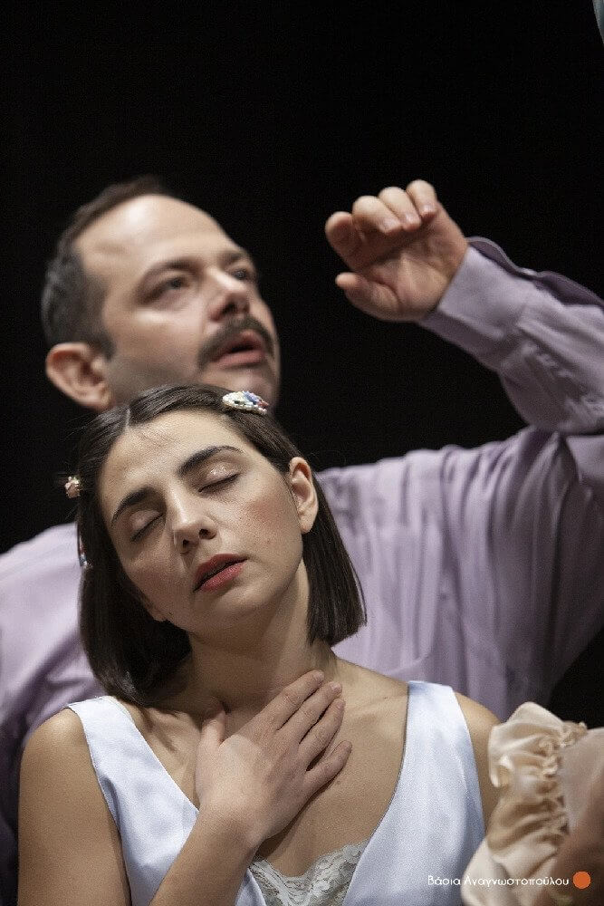 Ναι, σωστά, έχεις δίκιο. Η δραματοποίηση λοιπόν του Εμπειρίκου ήταν πολύ ενδιαφέρουσα, γιατί πέρασε πολλές μορφές. Δηλαδή δεν υπήρχε μία αρχική σκηνοθετική ιδέα και αυτή παρουσιάστηκε. Όχι. Υπήρχε δοκιμή, έρευνα, προσπάθεια, προτάσεις, ενστάσεις, δοκιμές, αποτυχίες, προσπαθήσαμε για τους χρόνους, τις αισθήσεις… Επίσης υπήρξε ένας διαρκής διάλογος με τη μουσική. Μα και η μουσική της παράστασης δεν φορέθηκε… εξελίχθηκε… Και η συνθέτης, η Λήδα Μανιατάκου, η οποία είναι και ηθοποιός, συμμετέχει και η ίδια και είναι παρούσα στη σκηνή διαρκώς. Άρα το αλισβερίσι και η σκηνική αποτύπωση του Τάρλοου είχε διαρκώς να λάβει υπόψη του πολλά στοιχεία και να τα κρίνει. Και να σου πω ότι η αρχή, που είναι και το ήμισυ του παντός, ήταν από τα τελευταία πράγματα της παράστασης που «κλείδωσε».