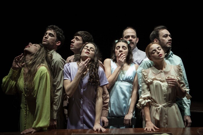 Υποβλητική η εικόνα που συναντάει ο θεατής, μπαίνοντας στην αίθουσα. Όλοι παρόντες, πάνω σε ένα διαφορετικό σκηνικό, ακίνητοι και μάλλον σε ύπνο βαθύ…