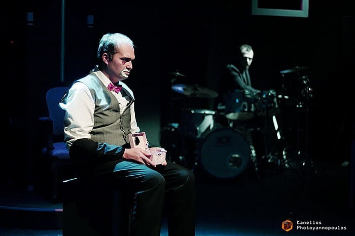 Ο Κωνσταντίνος Τσεντούρος περπατάει σε τεντωμένο σχοινί, ακροβατώντας ανάμεσα στο σουρεάλ και την καρικατούρα, αναδεικνύοντας όλες τις κρυφές πτυχές της προσωπικότητας του ήρωα. Μαζί του ο μουσικός Βασίλης Τσεντούρος, ο οποίος με τις μουσικές του επενδύσεις και τους ντραμιστικούς αυτοσχεδιασμούς, κινεί τα νήματα του ήρωα μουσικά και τον φτάνει στο τέλμα του.